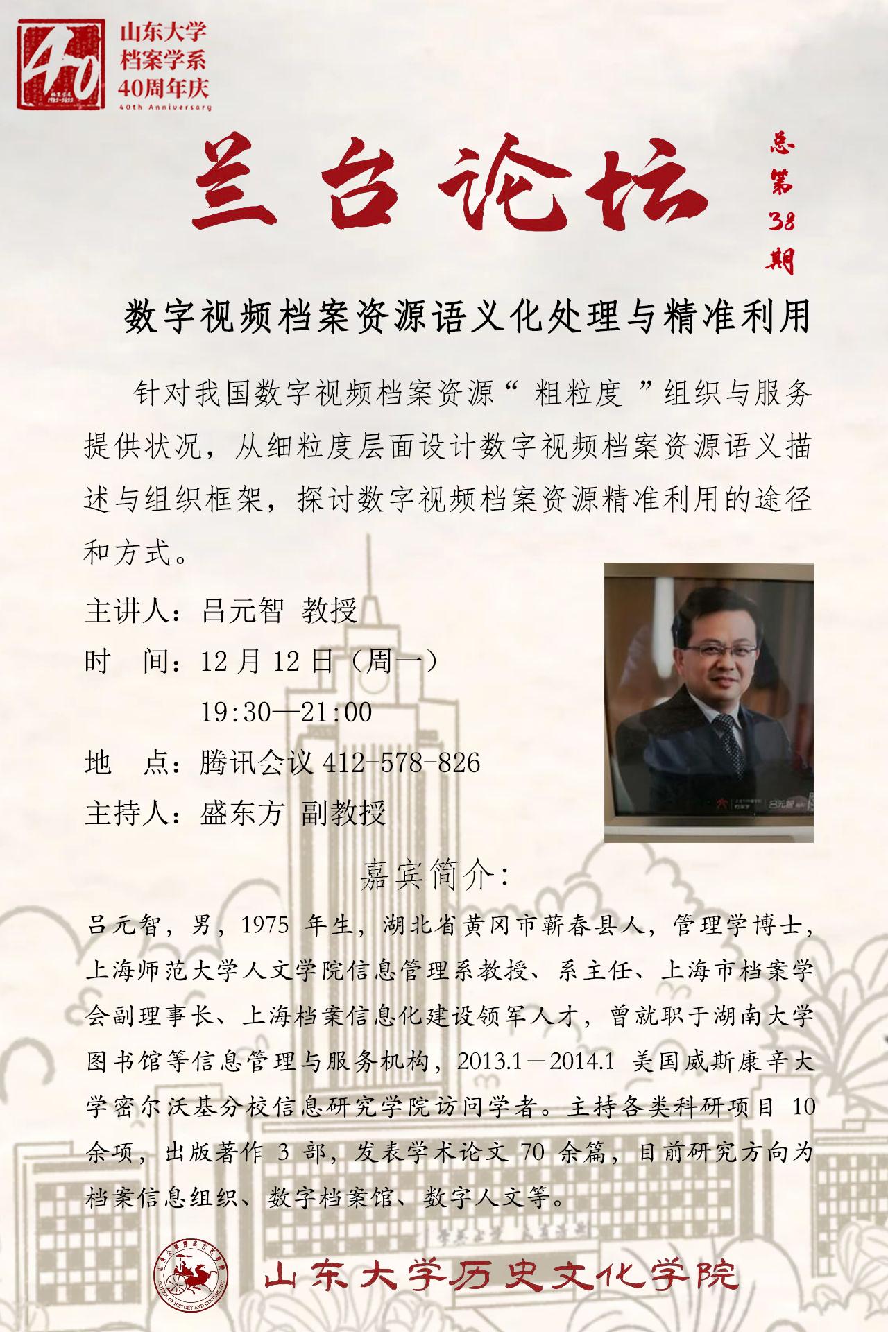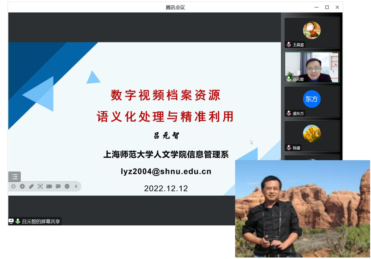 12月12日晚,上海师范大学人文学院信息管理系教授、系主任、上海市档案学会副理事长、上海档案信息化建设领军人才吕元智教授应邀为我院师生作题为“数字视频档案资源语义化处理与精准利用”的学术报告(线上)。此次报告是兰台论坛第38期,同时也是太阳成集团tyc151cc档案学系40周年庆(1982-2022)系列活动之一。盛东方副教授主持报告,档案学系及图书情报专业硕士学位点师生40余人参加了此次报告会。
