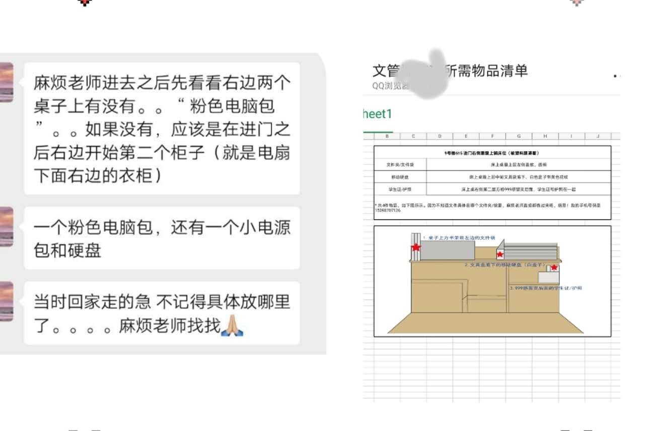 “老师,电脑在宿舍柜子里,柜子有锁……”,上门取件的小困难也没有难倒我们的“快递员”,和学生确认后,辅导员带着小型工具进入宿舍,成功“解锁”,顺利取出电脑并及时寄送。学生存放在宿舍的水果没找到怎么办?桌子上、床底下、柜子里,全面搜寻,终于找到了已经腐坏的黑色芒果,及时解决了学生“心头患”。偶遇“接单量”大,6个宿舍、6把钥匙、6层楼,电动车、小推车轮番出动,连同同学们需要的成绩单、户口复印件等影印材料,辅导员们逐一落实、精准“配送”。