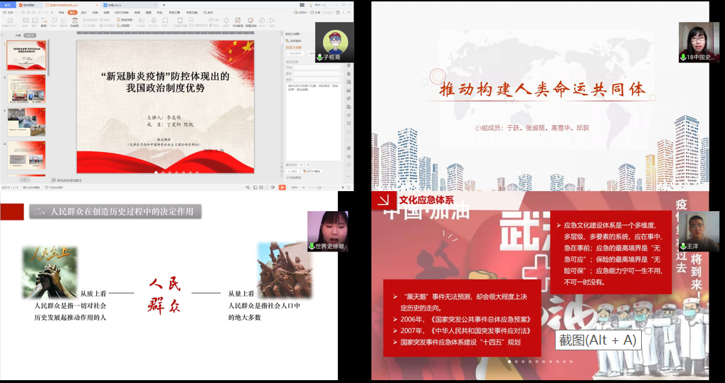 活动伊始,主持人毕楠简单介绍了本次思政课的比赛流程和评比规则,然后由七位团队主讲人依次结合PPT课件进行授课。李志伟团队结合时事,阐述了我国在抗击疫情中体现的政治制度优势。于跃团队展示了我国“一带一路”倡议所取得的丰硕成果,阐述了人类命运共同体的思想内涵与实践途径。徐敏团队选取《马克思主义基本原理概论》第三章第三节,以“谁是历史的创造者”为线索,讲解了群众在历史发展中的决定作用。孙崇辕团队结合文化产业管理的专业知识,从四个方面解读爱国主义的精神内涵。赵怡帆团队以五四运动为主题,分析五四精神在当代青年中的传承与创新,引导大家思考新时代青年们的使命与担当。孙辰睿团队则以“中国精神”为主题,解读了新时代青年的中国精神,又通过反面教材做对比,引发同学们对如何做好中国青年的深思。王洋团队从三方面讲述了疫情下的中国文化应急建设,结合实例,将理论知识讲解的生动清晰。