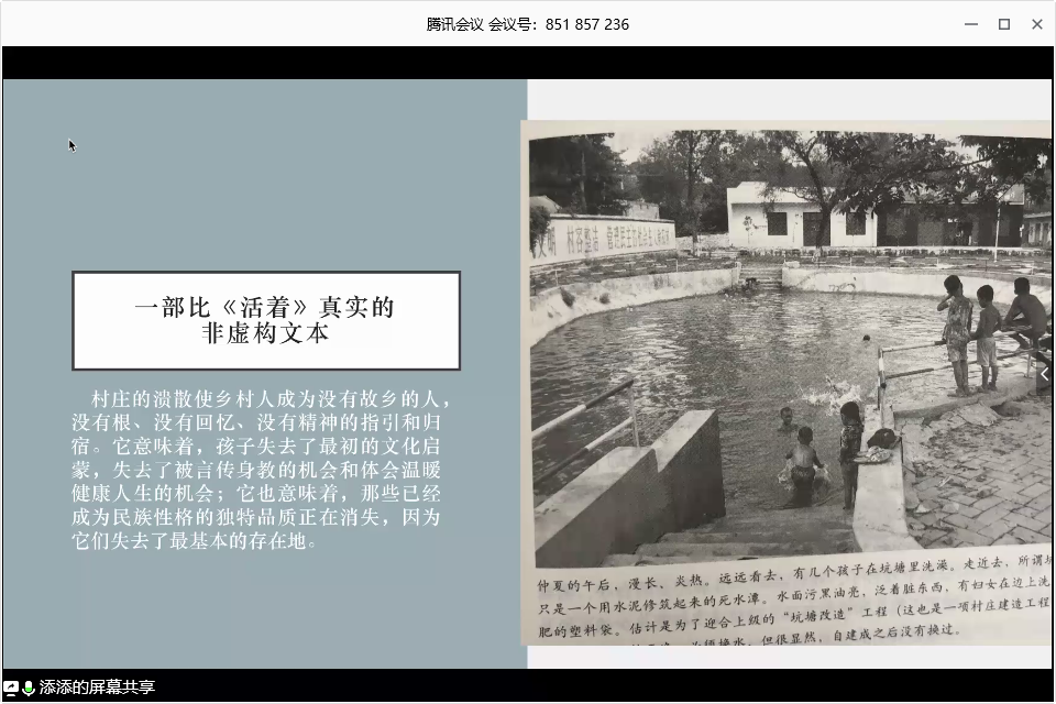 分享会伊始,曹雨铃先与支部成员分享梁鸿所著《中国在梁庄》大致内容与阅读感受。曹雨铃表示,《中国在梁庄》是一部比《活着》真实的非虚构文本。结合专业内容,围绕书中“文化茶馆”章节,曹雨铃重点为同学们介绍《中国在梁庄》中所提到乡村文化的盛衰。章军杰老师与曹雨铃就《中国在梁庄》背后的哲学内涵及乡村现状进行讨论,在这一讨论过程中,同学们感触良多。