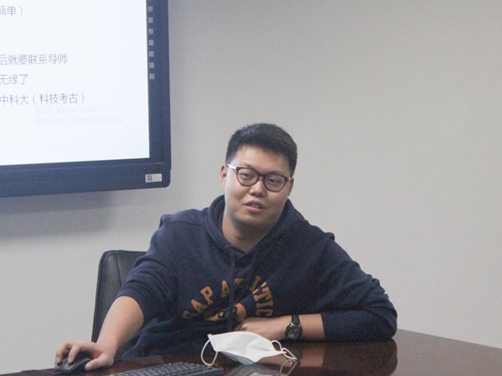 会议伊始,宋浦文学长对同学们关注的考研、保研问题对同学们展开了详细介绍,根据自身保研经验讲解保研、考研基本情况、时间规划及报考方式等重要信息。除了实用的考研信息,他从如何认识自己的专业、如何进行专业学习及如何确定未来目标这三个重要问题说开来,就生涯规划与长远发展等问题与同学们进行交流探讨。对于目前同学们要做好的事情,宋浦文学长建议同学们以学习为重中之重,全面发展,增加知识储备。针对当下“内卷”的社会热点问题,他也劝告大家正确看待保研,切忌恶性竞争,不过于追求功利,应用平和的心态加以对待,合理规划大学四年宝贵时光。宋浦文学长的分享中既有立足当下的经验之谈,也有放眼未来的长期规划,为同学们更好地了解研究生招生考试与规划未来发展路线提供了很好的借鉴与思路。
