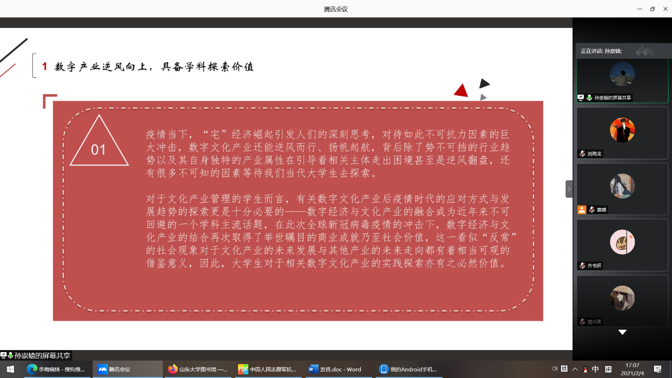 孙崇辕认为,在实习之前首先要明确实习动机。随着数字文化产业飞速发展并成为学术热点,出于现实意义与学术关怀,他选定山东今日头条网络有限公司作为实习对象。他介绍了文化激励工作相关内容,指出文化激励作为现代企业管理中不可或缺的部门,通过与新媒体技术的结合,能供创造“文化货币”,实现对企业员工更大的激励作用。他总结自己的实习经历,认为自己最大的收获在于走出了象牙塔,将所学与社会现实进行了结合,做到了理论联系实际。
