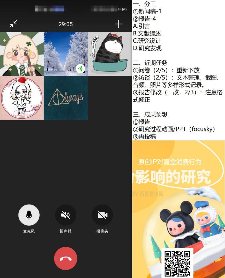 此次成果整理主要针对两个方面——问卷、访谈文本回收与研究报告修改。此前,团队成员在严格遵守防疫要求的条件下,进行了线上为主、线下为辅的半结构式访谈调研。在访谈过程中,一方面,团队成员与大学生盲盒消费者就对原创IP产品的态度、购买后社交功能的体现、盲盒社交现象的现状进行一问一答,以期分析原创IP的品控、知名度、造型设计如何影响玩家的品牌忠实度;另一方面,进一步围绕原创盲盒IP的文化元素进行开放式交流。团队经过严谨的数据整理与统计分析,在预期的研究方向上,对研究对象有了更为准确、深入的了解。