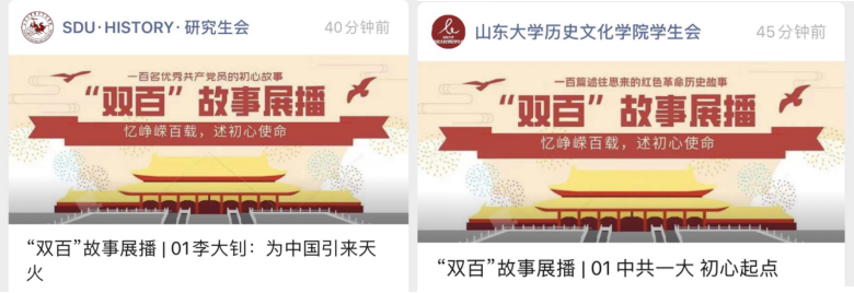 百年征程波澜壮阔,百年初心历久弥坚。为庆祝中国共产党成立100周年,深入贯彻习近平总书记在党史学习教育动员大会上的重要讲话精神,引领广大师生学史明理、学史增信、学史崇德、学史力行,坚定红色信仰、传承红色基因,自3月22日起,历史文化学院通过新媒体平台推出“忆峥嵘百载,述初心使命”——“双百”故事展播活动,该活动通过学生会和研究生会微信公众平台设立“双百”故事展播专题栏目,连续100天推送,介绍了百年党史上一百名优秀共产党员的初心故事和一百篇述往思来的红色革命历史故事。