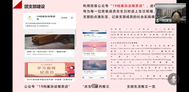 4月2日晚,历史文化学院举行2021年团支部达标升级答辩会,会议通过腾讯会议平台线上进行。团委书记李婧,研究生辅导员曹明明,本科生辅导员朱嘉铭、赵显锋、徐伯谦出席会议,学院团委副书记(学生)董欣怡主持会议。