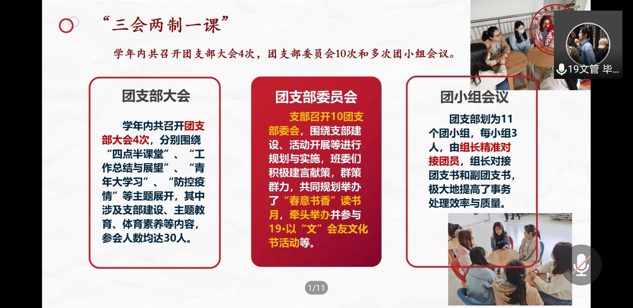各支部负责人按照会前抽签顺序,通过PPT展示,对过去一年中团支部的整体状况进行总结汇报。各支部围绕团支部概况、工作开展、成员风采等多个部分,对其丰富多彩的支部活动、支部成员的多元发展等方面进行详细介绍,充分展示了支部发展的的良好状况与团员青年的精神风貌。