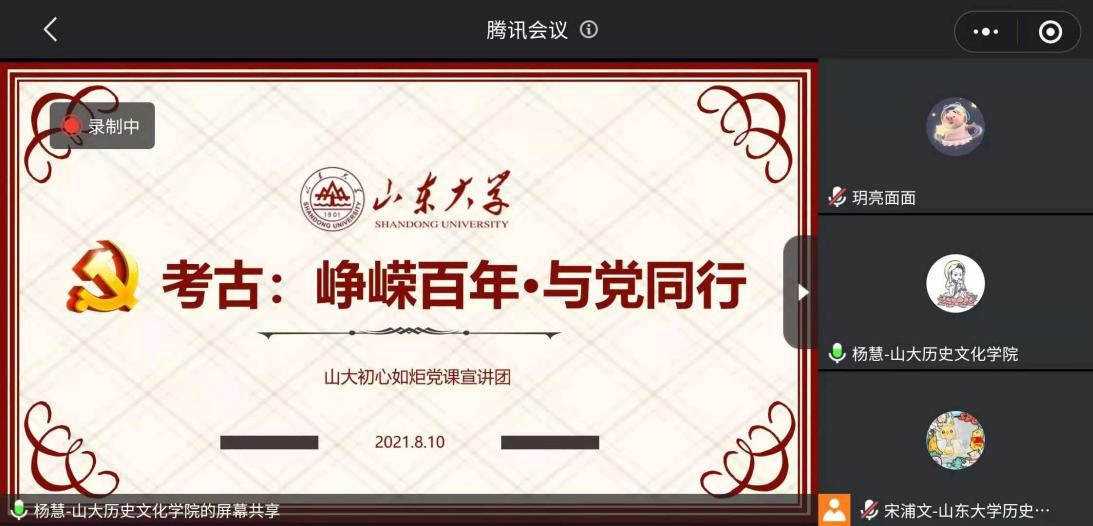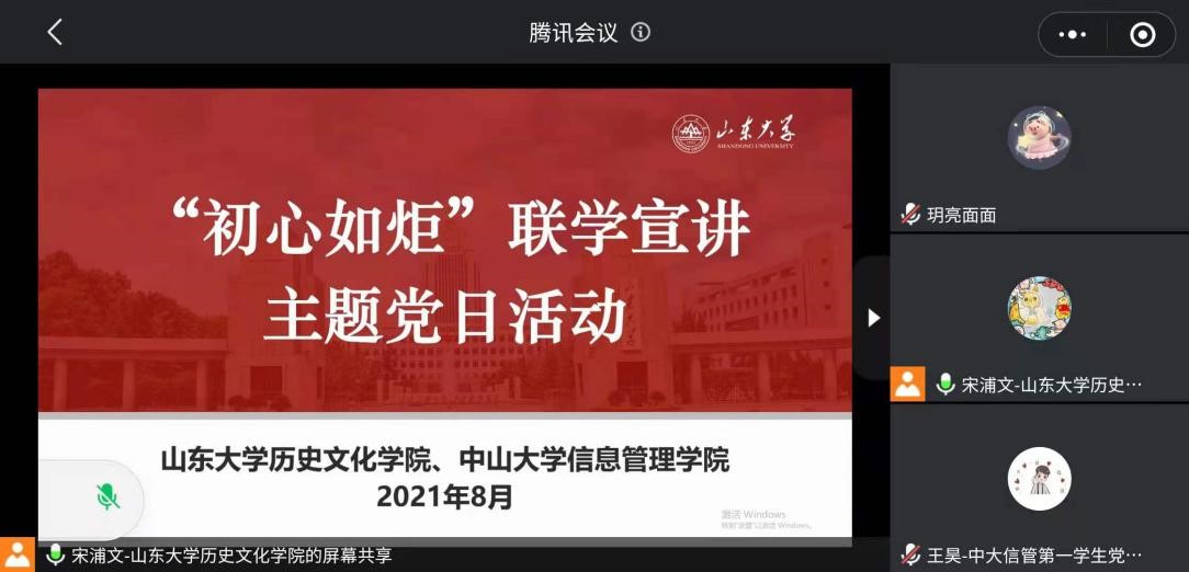 为充分发挥青年大学生党员的理论优势,深入推进党史学习在教育广大师生群体中走深走实,践行“三全育人”理念,多形式、多渠道、多载体加强学习教育,8月10日,历史文化学院“初心如炬”党课宣讲团同中山大学信息管理学院第一学生党支部展开线上联合宣讲活动,由历史文化学院硕士生第二党支部党员杨慧和中山大学信息管理学院第一学生党支部王昊担任主讲。