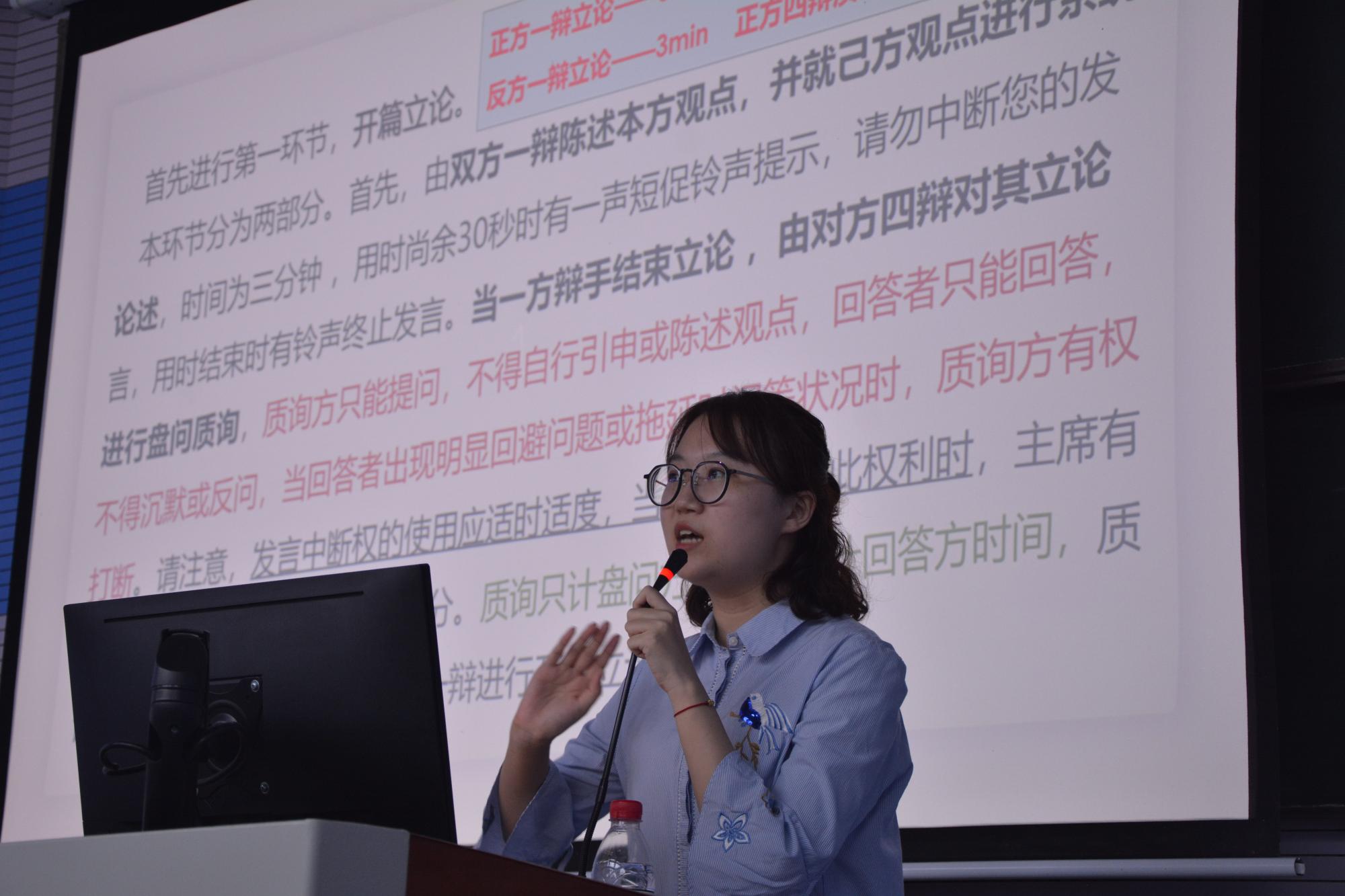 之后,院辩论队领队董欣怡进行具体介绍,其从辩论与辩论赛的定义、赛制、准备、进行和加入辩论队的原因以及“新生杯”辩论赛具体安排等五个方面生动幽默又深入浅出地进行了讲解,配合多方例子,从正面和反面运用多角度详实而准确地指出各要素的注意事项;同时,董欣怡强调,辩论作为一种语言的艺术对听众的引导和思考,让新生对辩论有了更进一步的认识,为下一步开展新生杯辩论赛打下良好基础。