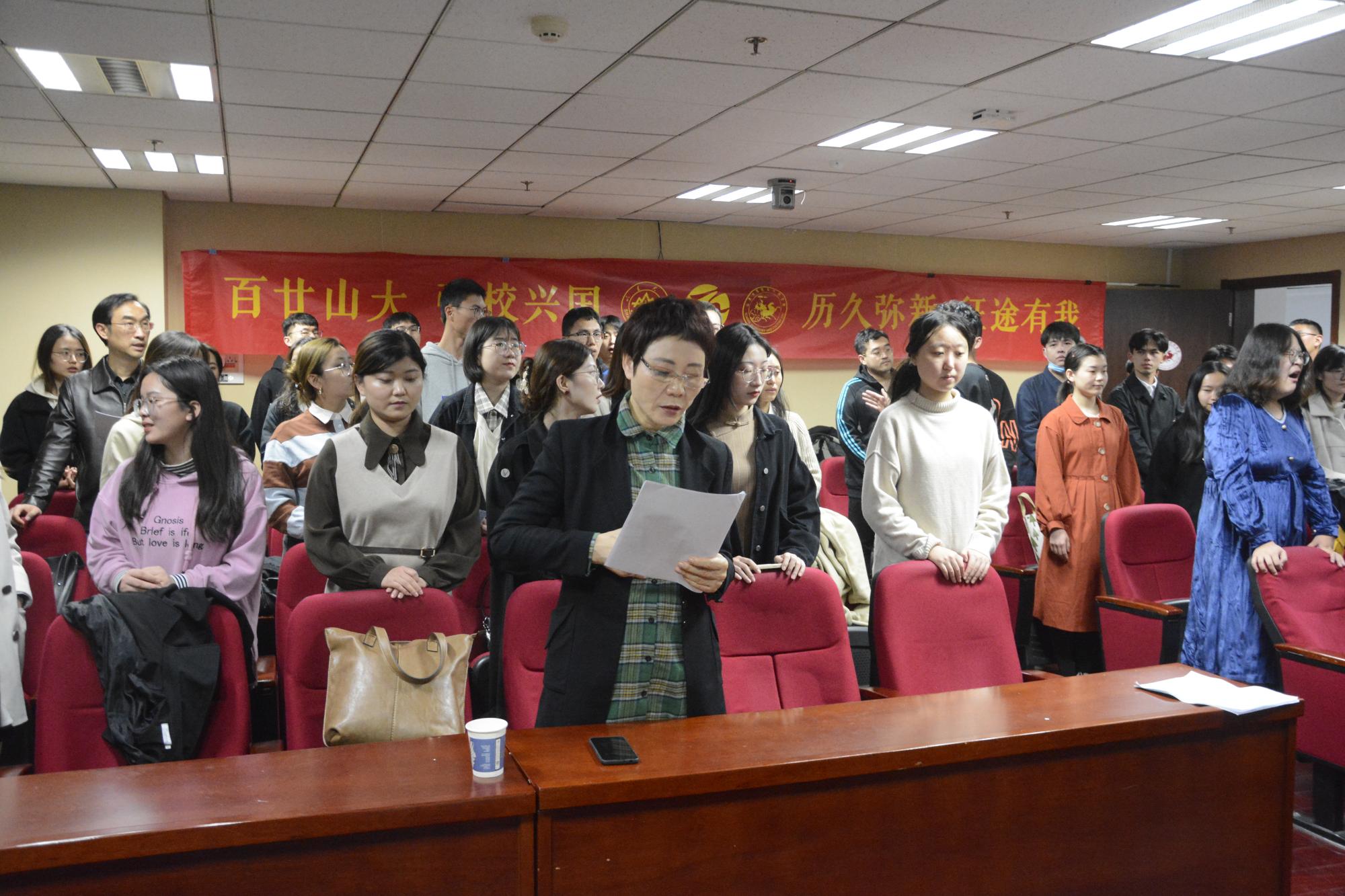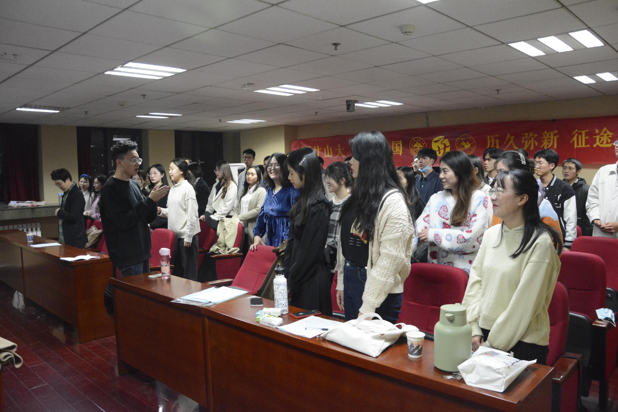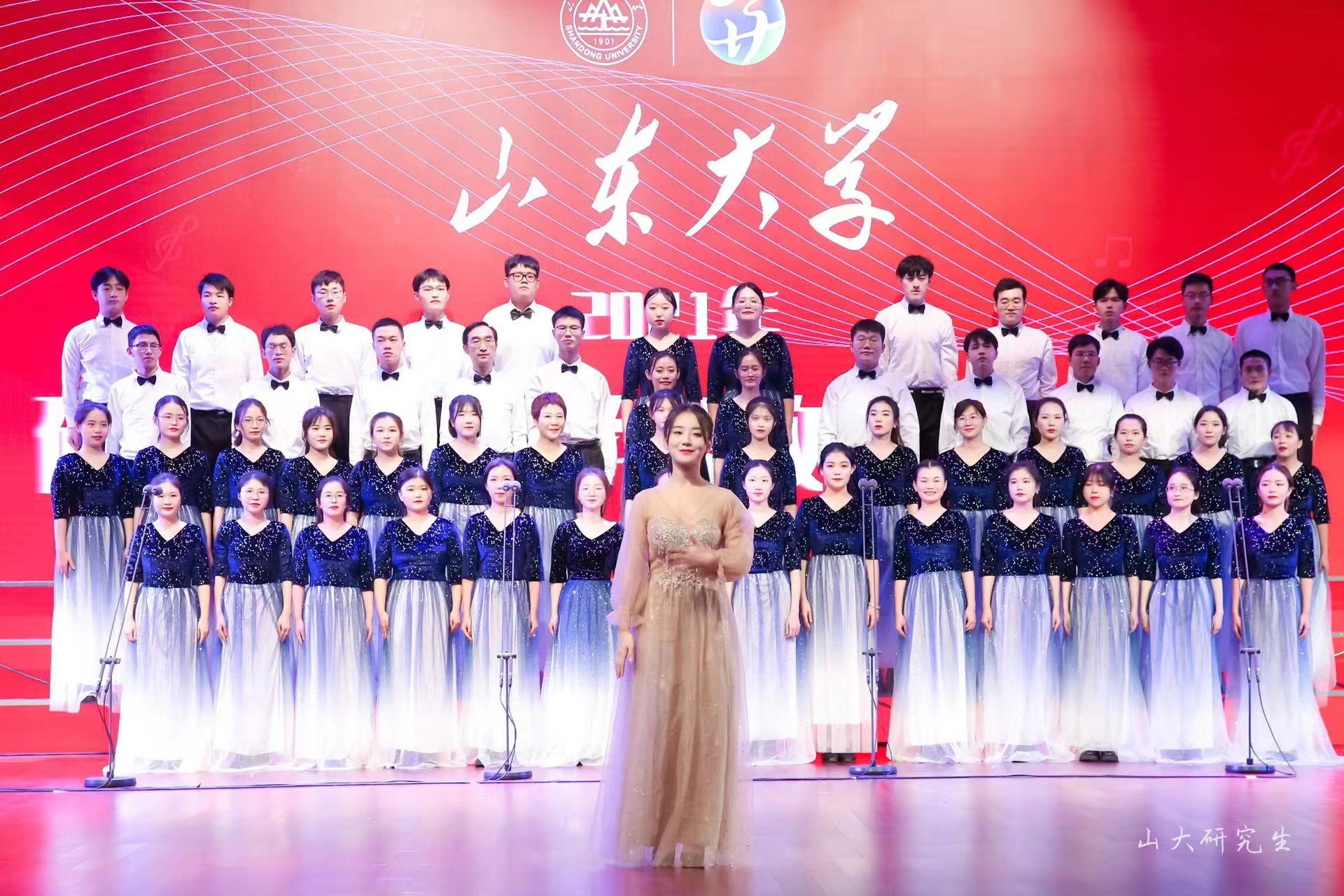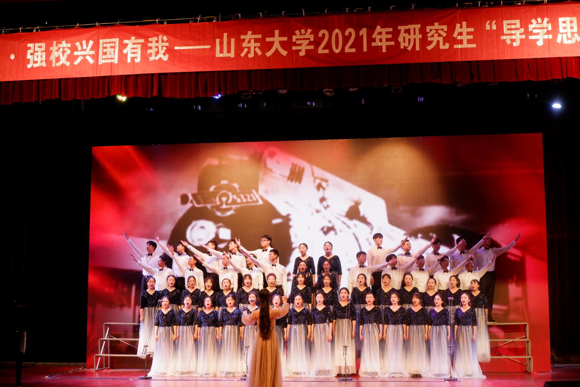 在第一首《没有共产党就没有新中国》的演唱中,师生们不断变换节奏,男、女声部交替演绎,高、低声部轮番出场,他们用深情激昂的歌声勇敢表达着对党的歌颂,现场洋溢着浓郁的爱国热情。紧接着的第二首是《太阳成集团tyc151cc校歌》,歌声一出,瞬间把人们带进太阳成集团tyc151cc悠久的办学历史中,悠扬动人的歌声层层推进,似乎在轻轻诉说着山大学子的文化积淀和优良的校训校风。