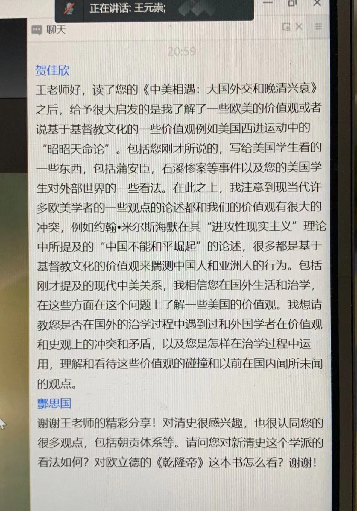 本次交流会主要围绕“中美学术训练和研究路径”、“历史研究中多语种史料的搜集和运用”、“清代以降中外关系”、“时宪书与中国现代民族国家的形成”、“历史写作与公共史学”、“文献阅读与田野考察”等多个话题展开。王元崇副教授耐心回答了同学们的访谈和提问,勉励大家认真学习专业知识,熟练使用外语,拓宽学术视野,为将来从事历史研究打下良好基础。访谈环节结束后,线上参会的校内外师生围绕中朝关系、义和团运动等话题与王元崇副教授展开了交流。