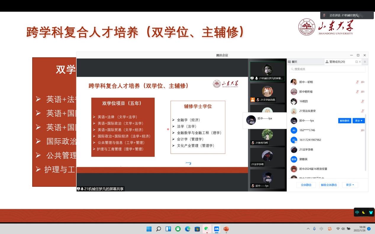 1月23日起,宣讲活动在各校陆续开展。考虑到陕西省疫情防控形势与要求,本次宣讲全程采用线上形式。为了做好活动预热,组员们提供了山大宣传视频在各中学进行播放,并利用腾讯会议等线上平台开展直播讲解。整体宣讲内容围绕“录取分数”“专业优势”“校园生活”三大模块展开,同时加入组员们的学习生活掠影与真实感受,符合高中学生现实需求,收到众多学子好评。