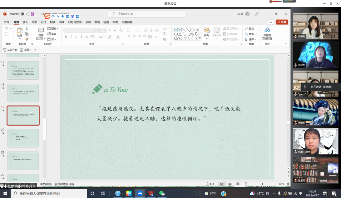 活动过程中,2020级档案学团支部学生将自己近期在身心、学业、人际等方面遇到的困惑和难题以“To You”为格式写在匿名纸条上,班委对21份纸条进行随机编号并设置抽签小程序,21位学生依次抽签获得特定编号,编号所对应的问题即该同学在活动进行过程中需要解答的问题。按照学号顺序,全班同学依次发言。发言同学结合问题分享自己的经验和经历,党支部教师代表轮流提出自己的想法和建议,帮助匿名提问的同学答疑解惑。