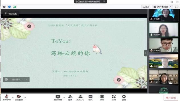 近日,档案文管教工党支部与2020级档案学团支部共同开展了“To You:写给云端的你”党团互助活动。在疫情防控常态化背景下,增进师生、生生互动交流,疏解心理压力和焦虑情绪,解答学生在学习生活方面的问题和困惑。档案文管党支部陈建、闫静、许晓彤以及2020级档案学团支部所有成员参加活动。
