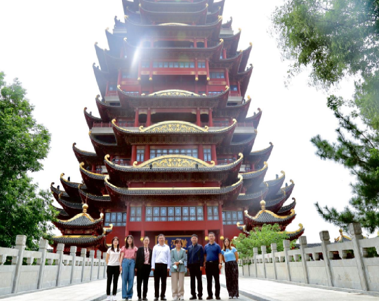 下午,实践团队前往滨州市参观标志性建筑黄河楼,认真听取滨州市黄河历史文化、工艺品展销、非遗传承、生态治理、产业发展等情况介绍。黄河楼主体建筑十二层,其九个明层与九重古建筑带斗拱起翘的屋檐,寓意黄河九十九道弯,流经九个省市自治区以及在山东流过九个市,是集观光旅游、黄河文化、孙子文化、滨州非遗展示等于一体的塔楼式建筑。其中,第十一层以全景黄河为主题,运用实景结合、楼景互动的形式展示滨州城市面貌;第八层记录了黄河闻名于世的六次重大改道;第五层设置以“水孕万物 自然天成”为主题的沉浸式生态体验空间、黄河骑行体验互动展项和生态修复慢直播全面展现沿黄生态治理;第三层以沉浸式场景展示胡集书会、吕剧、剪纸、草柳编等独具地方特色的民俗文化遗产。在多元互动与声光电各类高科技展项中,实践团队多维度认识滨州因河而生、因河而兴的黄河文化与城市故事。