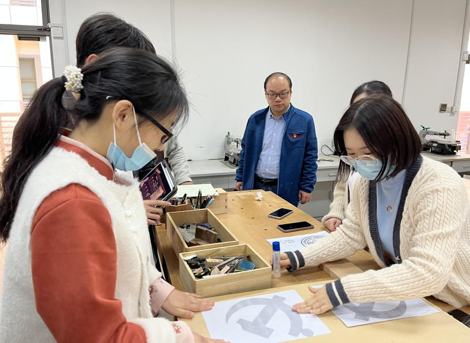 心得交流之后,同学们在工训中心老师的悉心指导下进行了党徽制作,以迎接党的二十大胜利召开。通过一刀刀雕刻、一次次打磨,镰刀和锤头组成的党徽在手中逐渐显现,我们也从中深切体会中国共产党始终代表中国最广大人民根本利益的先进性,感悟中国共产党“千锤百炼始成钢”的革命意志和敢于斗争、善于斗争的顽强斗争精神。