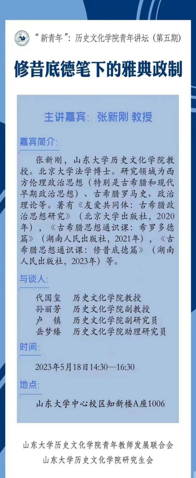 5月18日下午,“新青年:历史文化学院青年讲坛”第五期报告会举行。本次报告会的主题为“修昔底德笔下的雅典政制”,由世界史学系张新刚教授主讲,代国玺副院长以及孙丽芳、卢镇、岳梦臻、彭博等青年教师到场与谈。