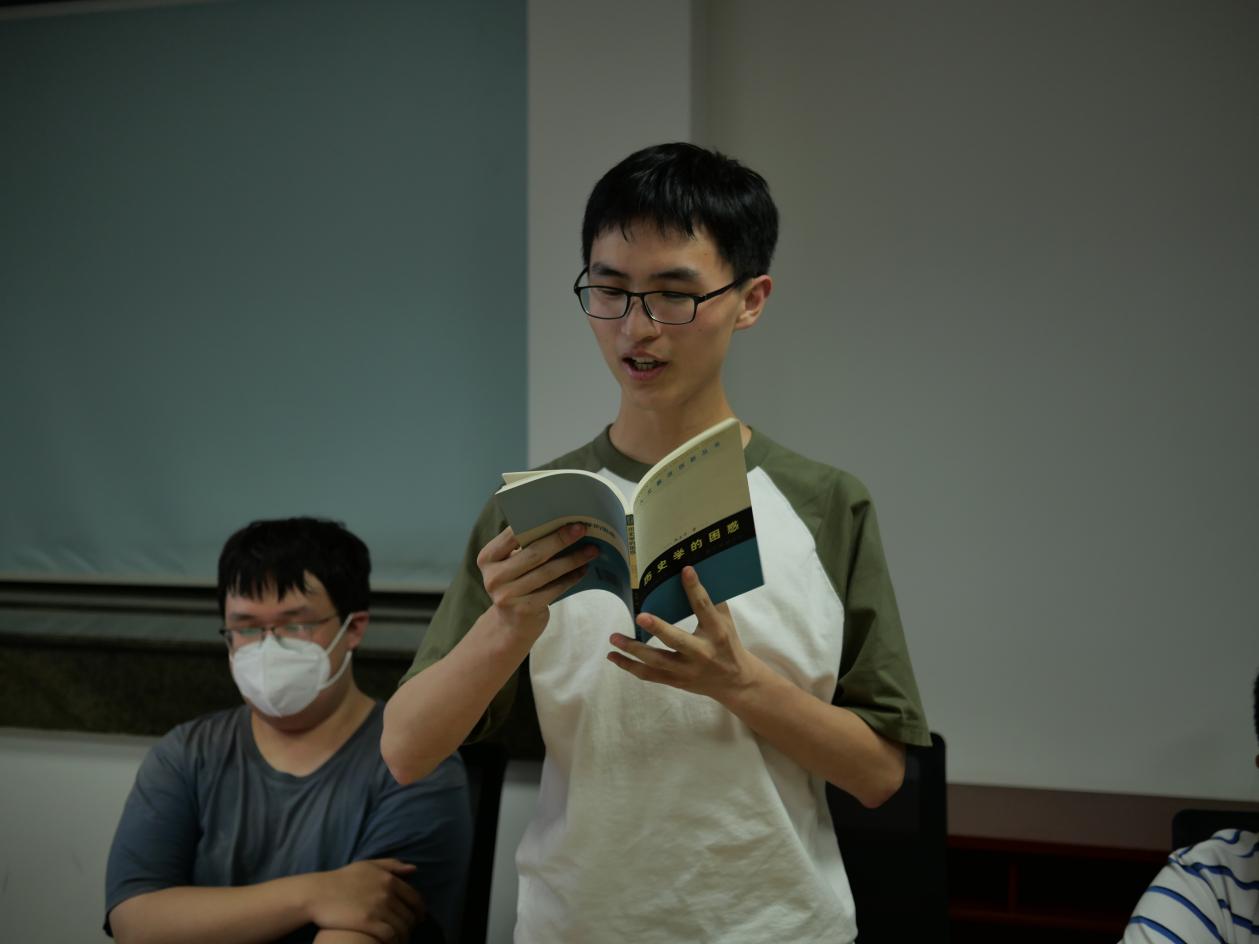 随后,参会的同学分享了自己的阅读心得。朱永珩通过阅读《习近平与大学生朋友们》,深入学习了习近平总书记关于青年工作重要思想,他认为阅读可以助力当代青年健康成长,也对未来的学习、工作、生活有很大启示。秦朔分享了《历史学的困惑》一书,结合专业知识,坚定了秉持优良的文化传统精神和开拓未来的信心,恪守历史科学真理的界限,遵循严格的学术道德。刘国栋同学分享了《置身事内》一书,带大家从微观和宏观两个层面认识了地方政府进行经济治理的基本方式。他提到,新时代的青年大学生应立志肩负起民族复兴的时代重任,正确认识和准确把握中国的改革历程、发展脉络及现实,更好地投入到相应的工作中去,要读书立志,要惜时如金、孜孜不倦、多读经典。