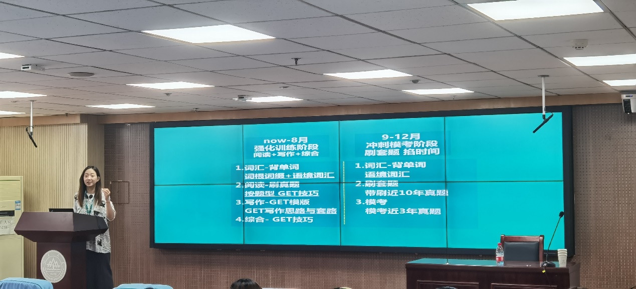 此次讲座中,张雨萌老师提出了从考研英语学习计划和真题讲解两大板块出发。在学习计划方面,张雨萌老师将整个考研英语复习以八、九月份为线分为了强化训练和冲刺模考两大阶段,并就两大阶段学习要点进行了细化说明。张老师表示,无论在那个阶段,英语词汇始终要作为重点对待,背诵要一直坚持到上考场前。