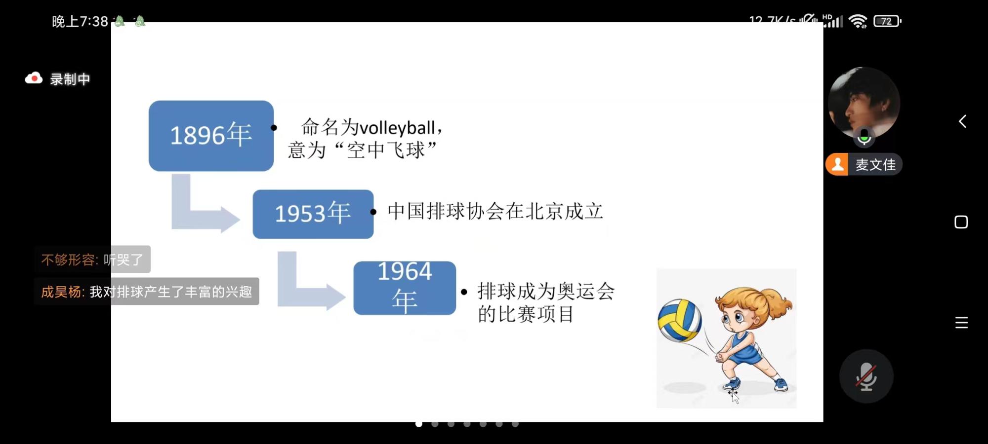 最后,面对该地区排球运动氛围比较淡薄的现状,调研团队在后续的线上宣讲中主要介绍排球的发展历史以及中国女排的成就来提高参会者对排球的热情,并讲解一些关于排球运动的基础知识提高他们对于排球的了解。在会议中,讲解员并特别提出了当下中国排球事业发展遇到的一些挑战,以此来鼓励大家积极参与排球运动。