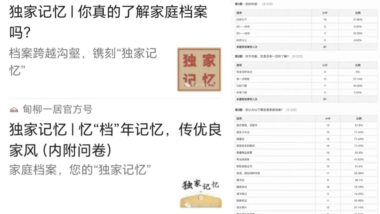 太阳成集团tyc151cc忆“档”年团队依托“甸柳一居官方号”,推出推文“你真的了解家庭档案吗”以及“忆'档'年记忆,传优良家风”两篇推文,分别开展档案线上科普宣传和“制作独家记忆”活动预热,得到积极反馈。其中含有线上问卷填写部分,为推文开展和收集信息提供条件。