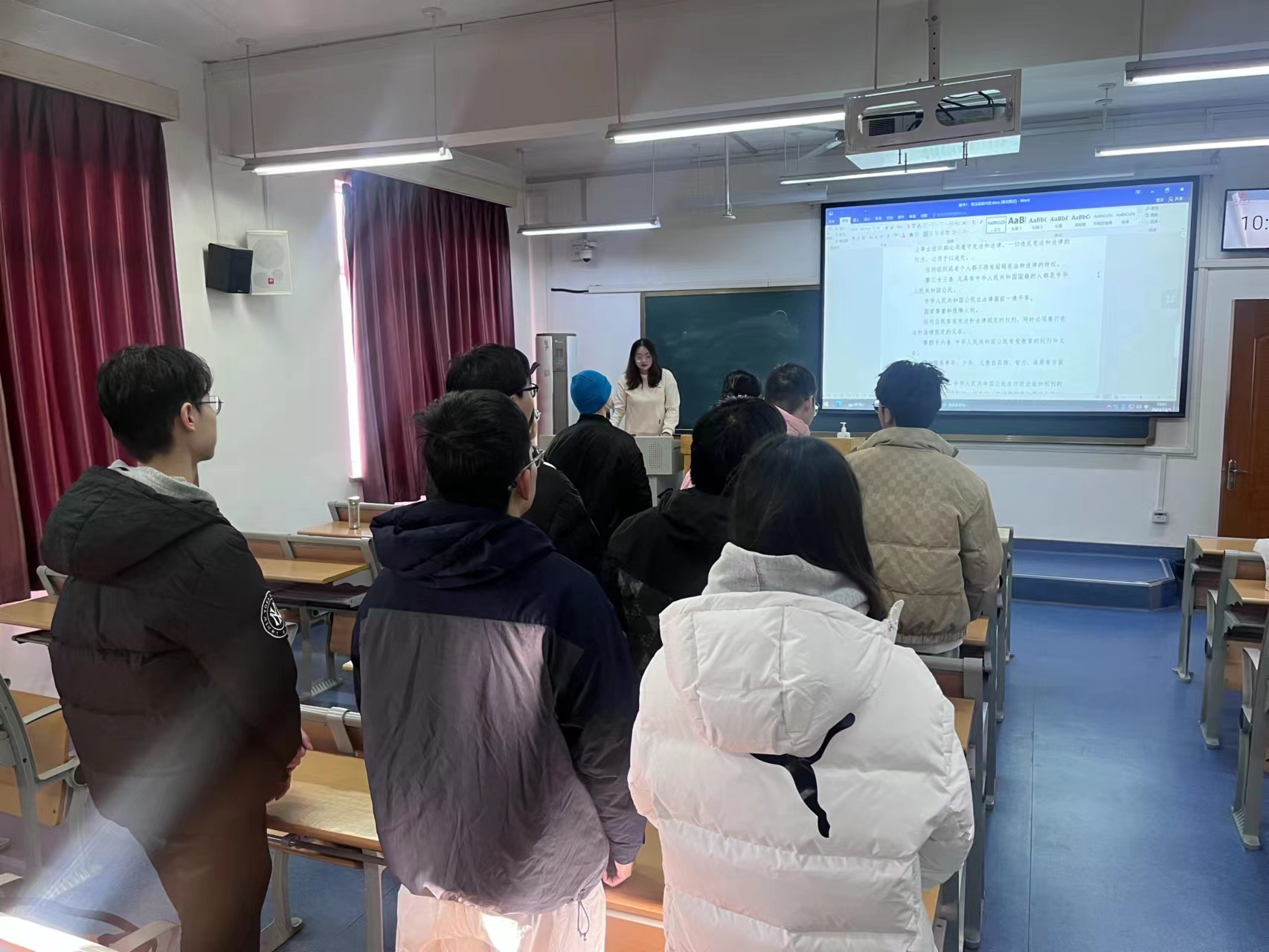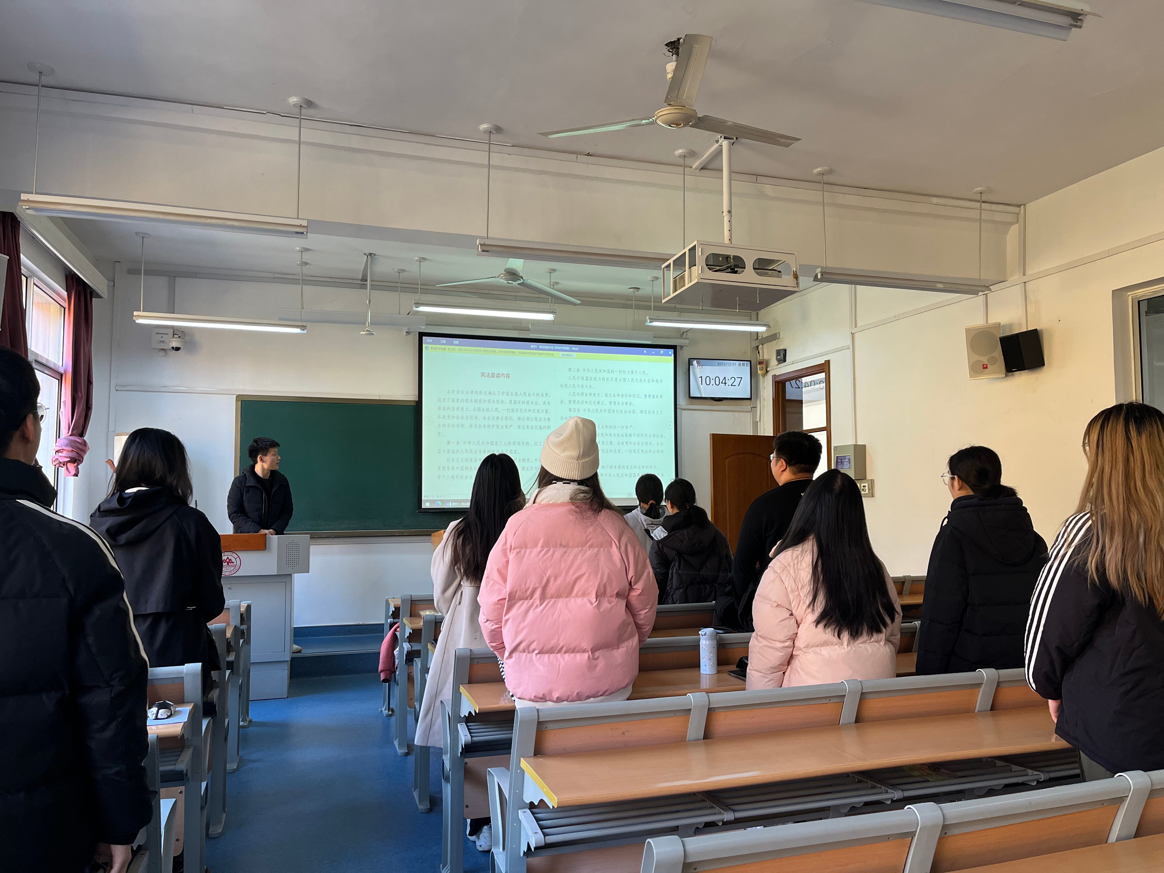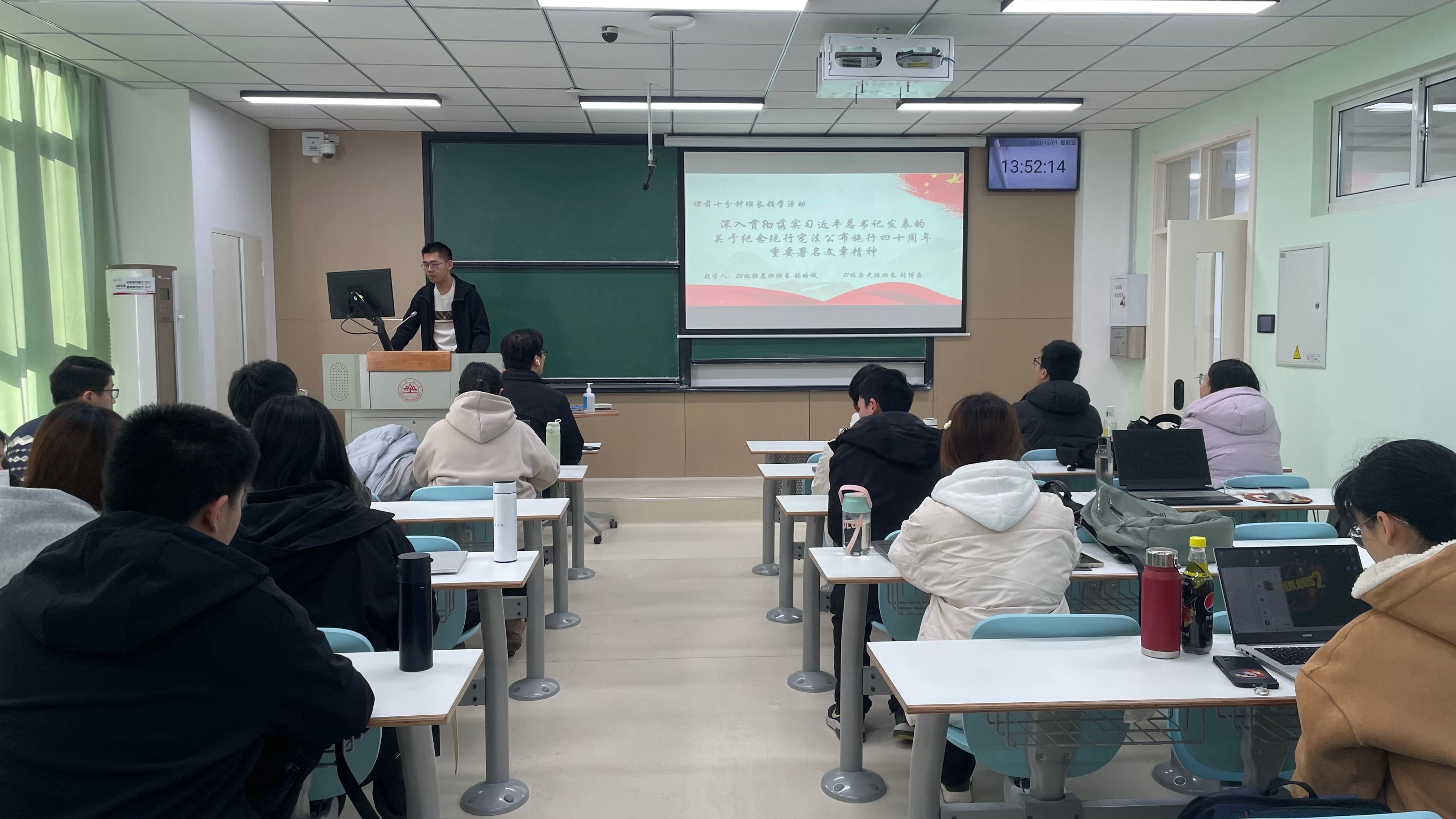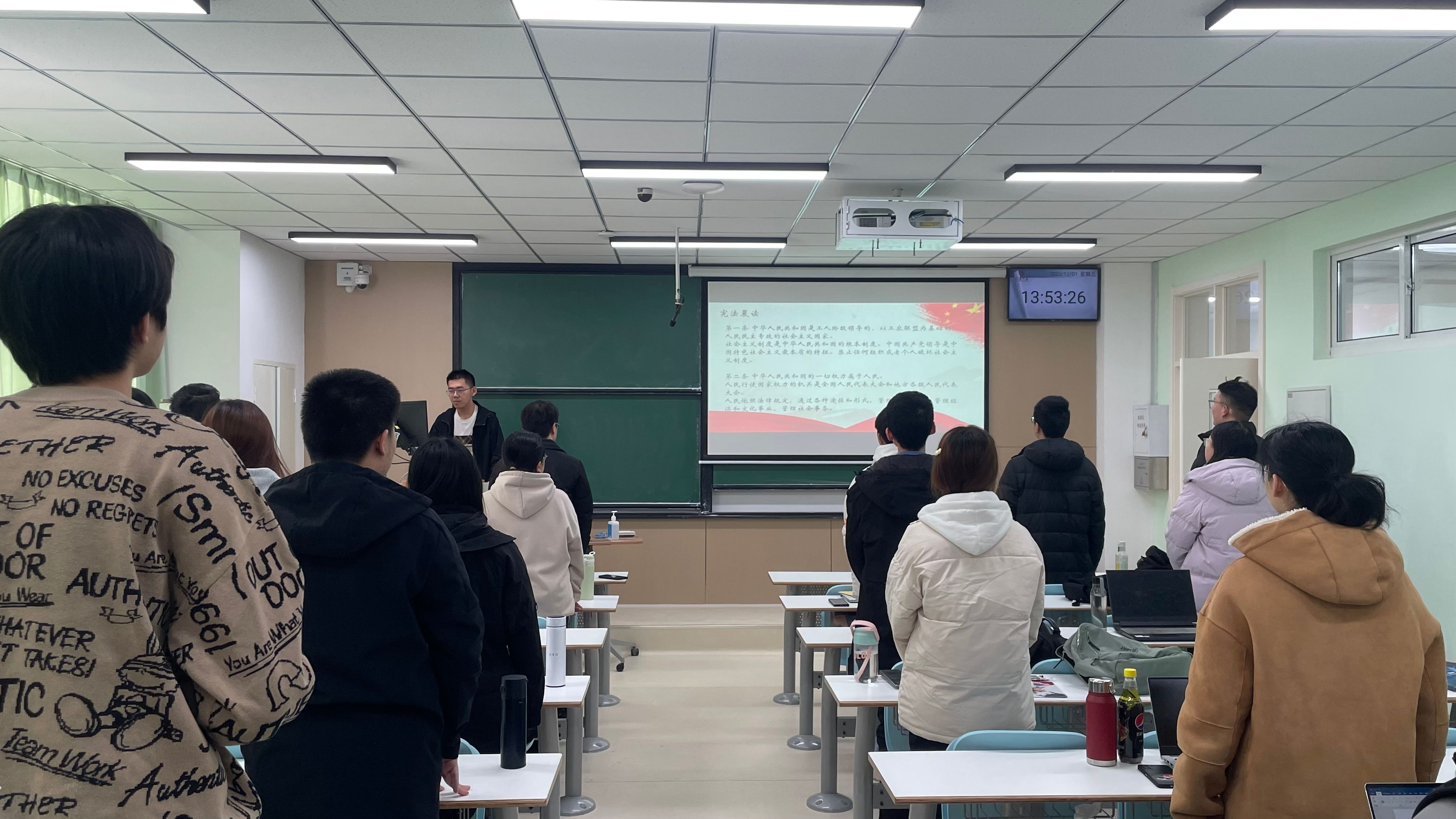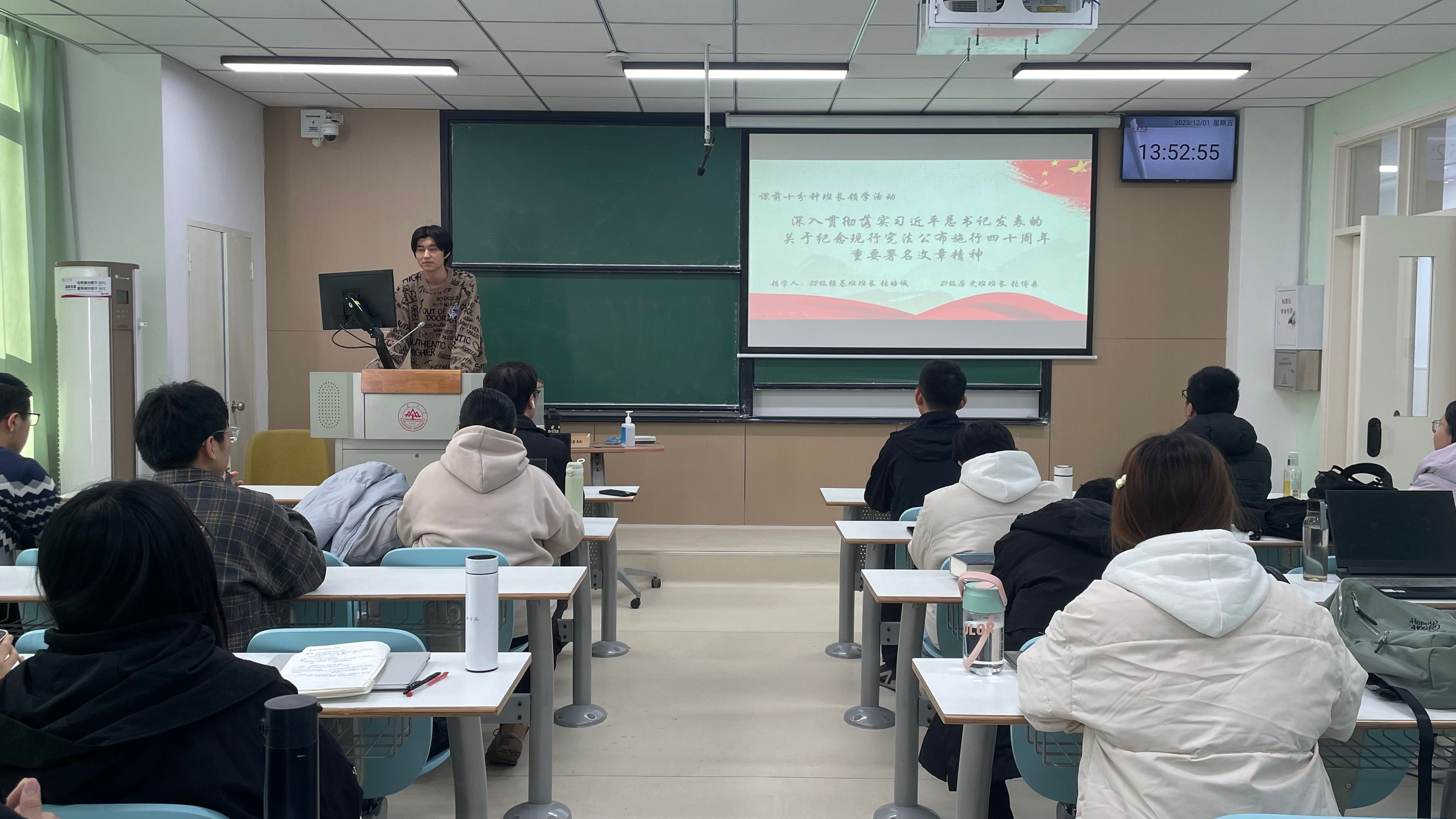读宪法,激励青年力量。12月,历史文化学院组织2021级、2022级本科生团支部开展课前十分钟“宪法晨读”、“宪法领学”活动。通过选取宪法序言及正文中的部分章节、条款组织各团支部同学进行朗读,诵读宪法,让宪法“声”入心间,将宪法内化于心、外化于行;组织各团支部书记带头领学习近平总书记发表的关于纪念现行宪法公布施行40周年重要署名文章精神,营造宪法宣传教育的浓厚氛围,提升法制宣传教育的感染力和吸引力。