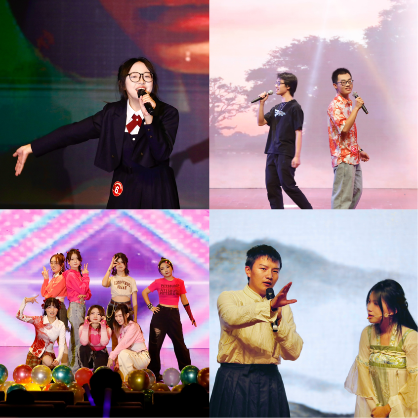 晚会第一篇章,德吉措巴、史凌熙带来歌曲《危险》,向大家诉说永远年轻、永远热烈奔放的青春故事;秦依童的《这世界那么多人》,把心底的柔软和温暖娓娓道来;钢琴曲《浏阳河》在王姝涵的指尖跃动而出,搭配上徐赫杨、李彦霏等同学的柔美舞蹈,灵动婉转;戏曲串烧《花雅合韵》,张天翊同学的《游园惊梦》和学院党委副书记张伟的《锁麟囊》在抑扬顿挫之中把传统戏曲的魅力体现得淋漓尽致。