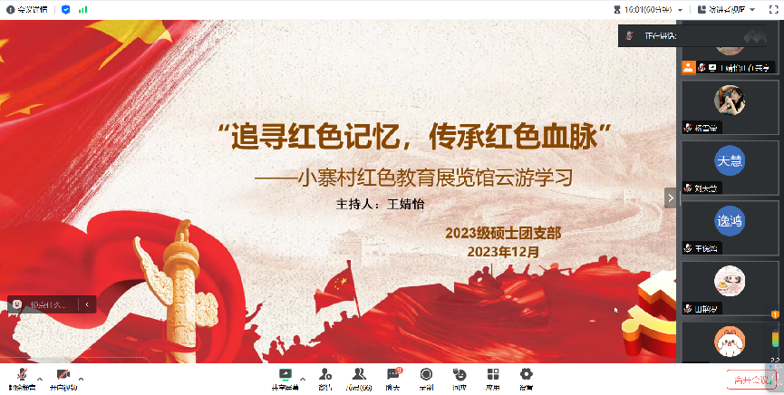 2023级硕士团支部通过腾讯会议集体云游了关于济南市天桥区桑梓店街道小寨村红色教育展览馆。在云游中,支部介绍了展馆占地面积及建筑风格,着重解读了有关建筑所具有的独特内涵和价值取向,突显了展馆红色精神的文化内核,支部成员在过程里也逐渐明晰了小寨村乃至桑梓店街道在党建引领的“红飘带”指引下的发展历程。通过学习,大家深刻体会到了党员队伍干事创业的凝心聚力,感受到乡村振兴为小寨村带来的巨大发展变化,并纷纷表示,将认真学习领会习近平新时代中国特色社会主义思想,在今后的工作中充分发扬共产党人甘于奉献的精神,真正做到学史明理、学史增信、学史崇德、学史力行。