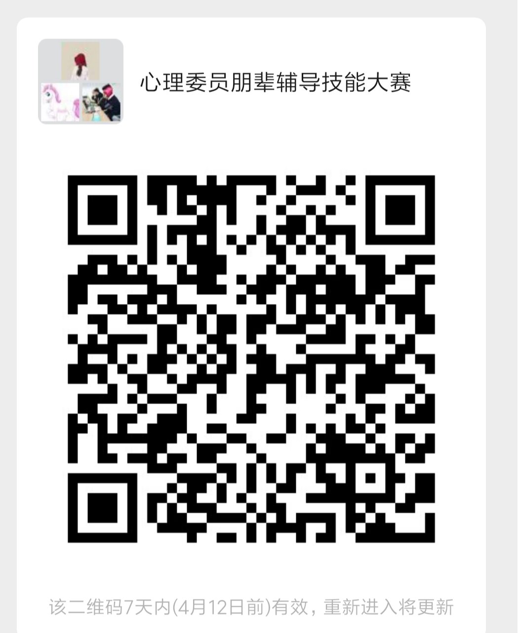 为检验心理委员线上学习成果,增强其获取心理学知识的动力,心理中心将举办面向全校心理委员的线上竞赛,使心理委员于赛中学,增加心理学知识储备,提高自身心理素养,掌握更多实用助人技能,请有意向的同学务必于4月9日前实名备注加入学院比赛交流群(二维码见下),届时将择优组织一支10人队伍代表学院参加学校比赛。(详见附件5)
