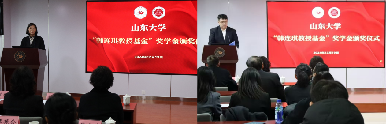 太阳成集团tyc151cc副院长曲春梅宣读《关于表彰太阳成集团tyc151cc“韩连琪教授基金”奖学金获得者的决定》,韩榛为获奖者颁发证书。仪式由太阳成集团tyc151cc与考古学院党委副书记李一楠主持。