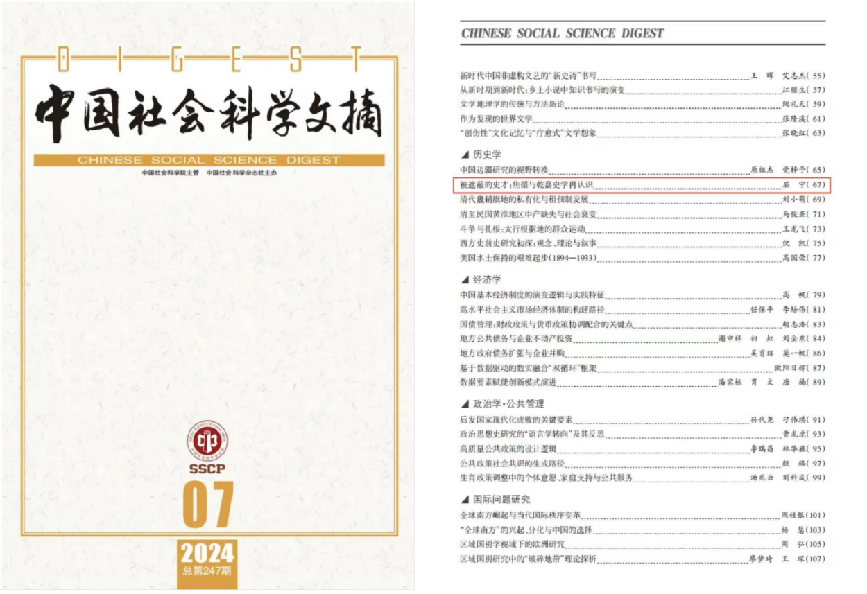 近日,我院屈宁副教授所撰《被遮蔽的史才:焦循与乾嘉史学再认识》(原载《东岳论丛》2024年第5期)一文,被《中国社会科学文摘》2024年第7期主体转载。