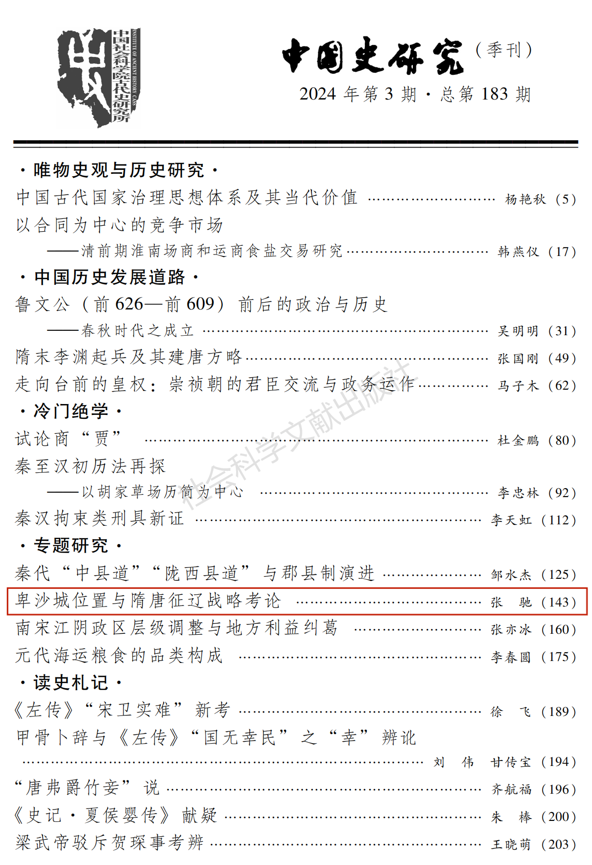 我院助理研究员张驰撰写的《卑沙城位置与隋唐征辽战略考论》一文在《中国史研究》2024年第3期正式发表。
