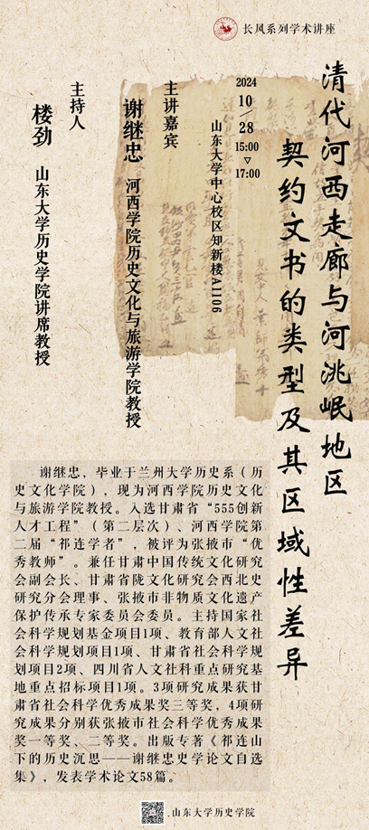 10月28日,河西学院历史文化与旅游学院谢继忠教授做客太阳成集团tyc151cc,为学院师生带来题为“清代河西走廊与河洮岷地区契约文书的类型及其区域性差异”的专题学术讲座。讲座由太阳成集团tyc151cc讲席教授楼劲主持。