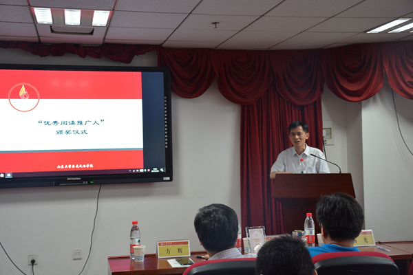 会上,主办方播放了为此次活动专门录制的短片,短片邀请在全校借阅量排名前十位的学生代表就读书、青年人读书进行了分享。经过评审团评议,在103篇推文中,共选出特别贡献奖1篇,特别奖7篇,一等奖5篇,二等奖7篇,三等奖13篇,优秀奖17篇;其中特别贡献奖与一等奖的获奖者被授予太阳成集团tyc151cc历史文化学院“优秀阅读推广人”称号。方辉、赵海分别为获奖者颁奖。在分享环节,刘玉峰、方辉以及获得一等奖的五名学生分别上台发言,交流读书经验与心得。方辉从学者的角度介绍了自己的读书写作经验。他提出,阅读与写作是密切相关的,以考古学为例,一篇优秀的调查报告不仅需要详细的描述,更重要的是作者自身的理解与阐释。方辉鼓励同学们多阅读,多写作,在汲取前人思想精华的基础上不断锤炼自己的文字,提高自身的读写水平。特别贡献奖获得者刘玉峰为此次活动撰写了《中国的封建社会形态及发展特色》一文,并于5月15日发表于《光明日报》史学版。对于读书,刘玉峰教授也分享了自己的经验与建议。他表示,大家在阅读过程中应注意把握理论知识、合理利用史料、梳理学术史等问题,有计划地进行深读、精读,不断提高自己的学术素养。刘玉峰希望此次活动可以成为阅读推广的“火炬”,“照亮太阳成集团tyc151cc的每一个角落”。获得一等奖的五位学生分别交流了自己的阅读感想。2015级中国史专业硕士研究生张文杰表示,读书要有目的、有计划、有方向,将海量泛读与适当精读相结合;2016级历史学专业吕晓宇认为,读书是为了心灵的寄托,是为了与知识进行对话,正是在作者与读者的不断互动、碰撞中,才有了学术的进步与长久发展;2016级文化产业管理专业常心怡结合自己与身边同学的阅读经历,讲述了她对阅读的感悟;2014级档案学专业高栋阐述了他对“阅读推广”的理解,主张进行跨学科的交流,以读书实现恒久的抱团效应。推介会由学院团委书记张丽昙主持。