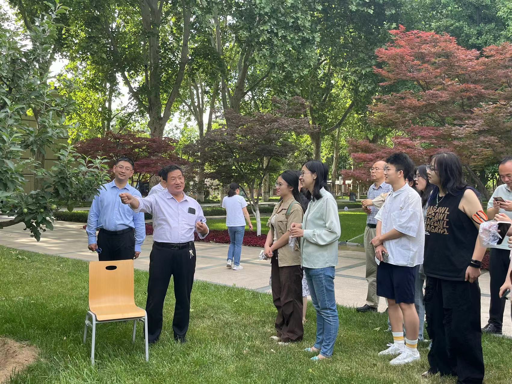 随后,大家来到校园内大成广场的苹果树种植区域,进行实地操作和体验。党员们分成若干小组,亲自参与苹果树的疏果套袋工作。谢东斗向大家演示了正确的疏果方法,他表示要根据果树的生长情况和果实的大小、位置进行选择性疏果,确保留下的果实能够得到充足的养分和光照。他向大家讲解了套袋的步骤和注意事项,如何确保袋子贴合紧密,既能保护果实不受虫害侵扰,又能保证果实的品质和色泽。在实际操作中,党员们和青干班学员表现出了极高的热情和积极性,他们认真观察、仔细操作,互相交流心得。