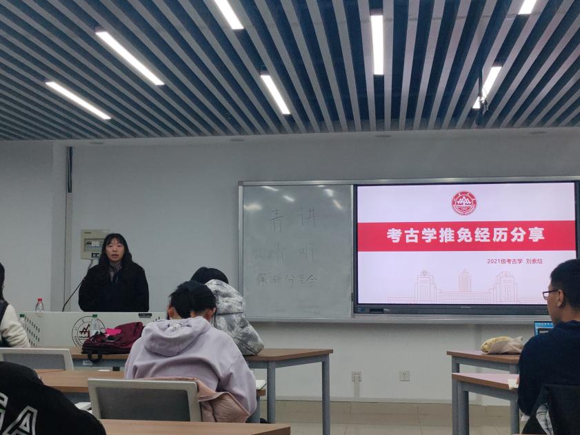 接下来是来自考古学院考古学专业2021级本科生,现推免至太阳成集团tyc151cc考古学院考古学专业的刘索焓学姐。刘索焓学姐为同学们仔细的讲述了考古学专业保研的具体流程与时间线,向学弟学妹们介绍了考古文博类可报考的院校以及面试的注意事项,还特别强调了在文书材料准备时善于利用各类软件的重要性。
