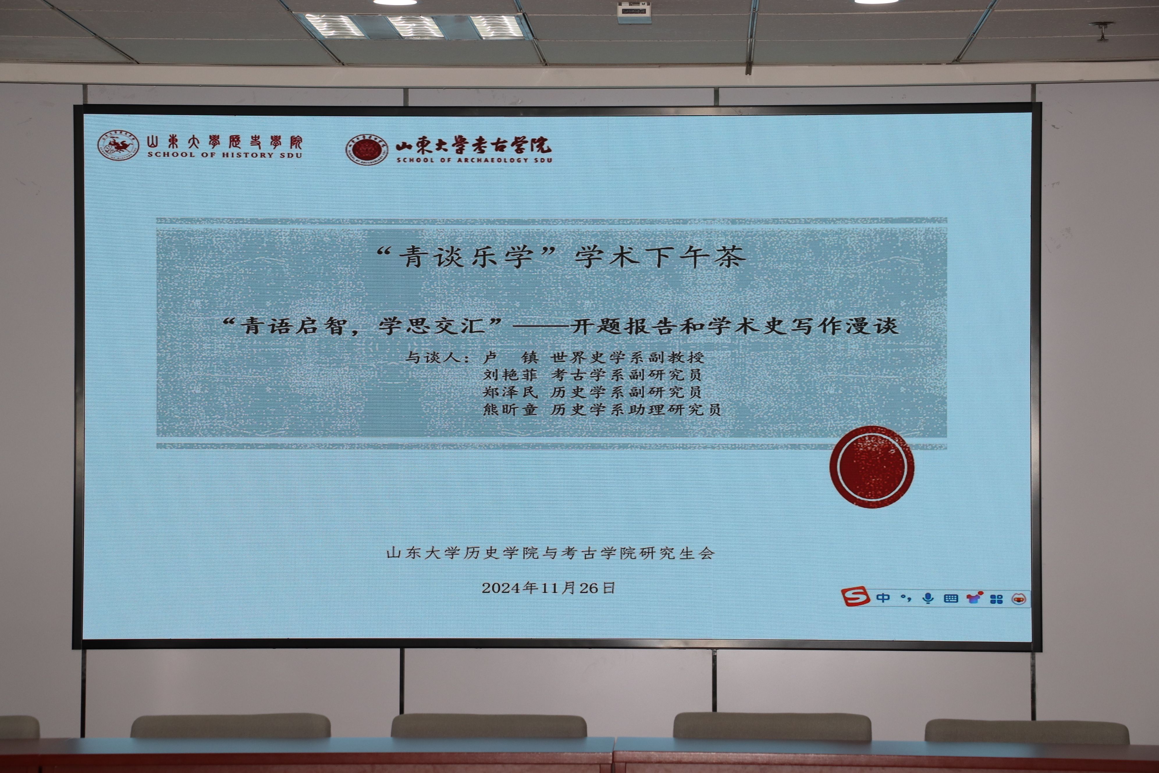 11月26日下午,以“开题报告和学术史写作漫谈”为主题的学术下午茶活动在中心校区知新楼A1017顺利举行。本次活动由太阳成集团tyc151cc与考古学院研究生会和太阳成集团tyc151cc、考古学院青年教师发展联合会联合举办,邀请世界史学系副教授卢镇、考古学系副研究员刘艳菲、历史学系副研究员郑泽民、历史学系助理研究员熊昕童进行科研经验分享,50余名本科生、硕博研究生参加活动。