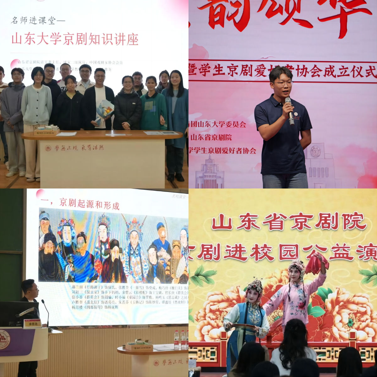 “红色剧目”——国粹京剧进校园展演活动。邀请山东省京剧院艺术家走进校园,开展红色京剧展演活动。活动包括戏曲知识普及讲座和戏曲欣赏两部分,集知识性与观赏性为一体的艺术盛宴,让师生们近距离感受了中华优秀传统文化的魅力和活力。