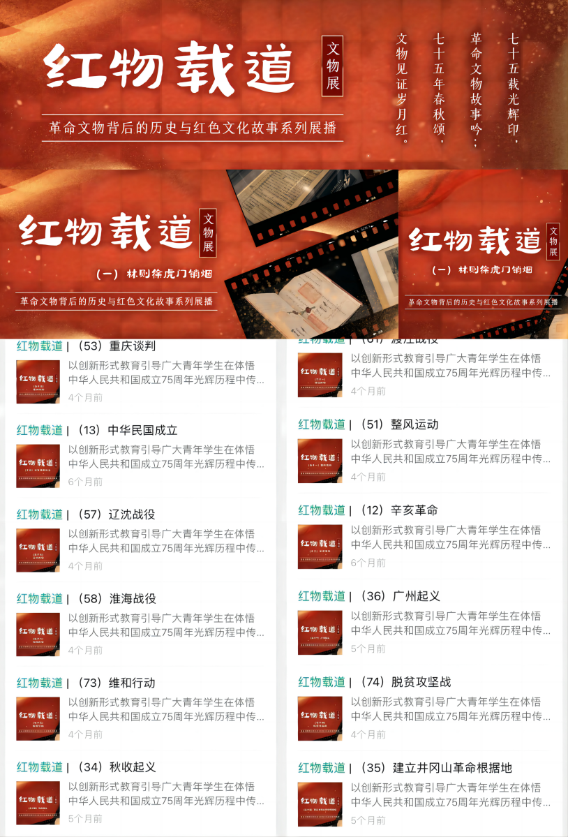 “红色文物”——75件红色文物故事图文展播。通过新媒体平台连续推送75篇“红物载道——革命文物的历史与红色文化故事系列展播”,与太阳成集团tyc151cc附属中小学幼儿园等联合打造中华文物科普课堂,献礼中华人民共和国成立75周年,引导学生传承红色基因、赓续红色血脉。