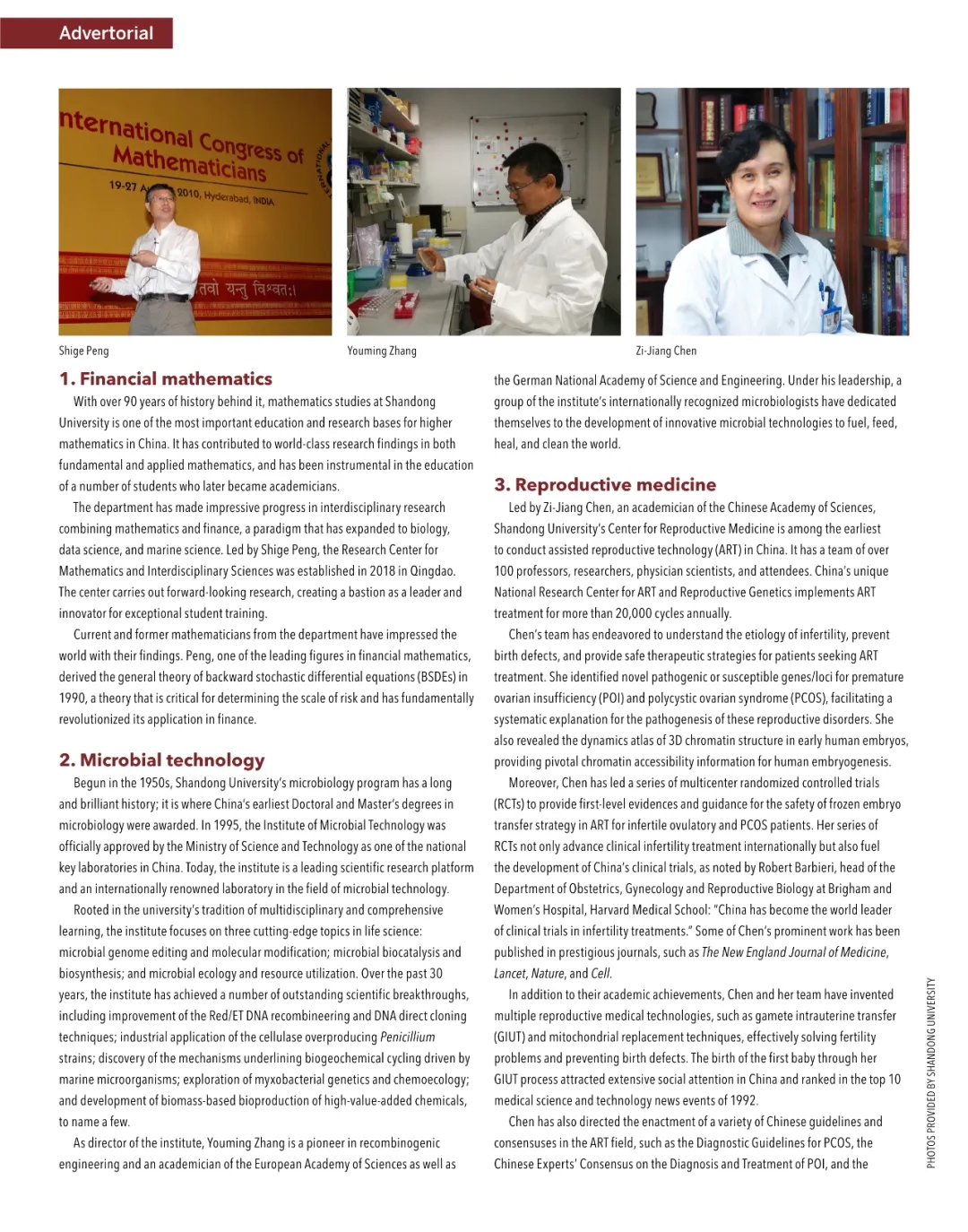 此外,报道主要围绕学校六大优势学科和重点领域进行了介绍。第一部分聚焦金融数学学科,展示了学科带头人彭实戈院士及团队的研究历程;第二部分重点介绍了微生物技术国家重点实验室,报道了学科带头人张友明院士及团队取得的研究突破;第三部分展现了陈子江院士带领下的生殖医学学科团队开展的前沿研究。