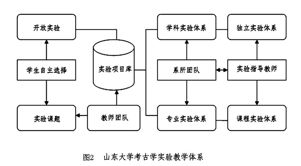 考古实验教学示范中心的实验教学体系具有“队伍、教材、体系、硬件”高度共享、相互融合的特点,以教授为主体组建核心团队和不同层次的开发梯队,明晰了考古学科综合实验教学平台的管理层次和内外协调机制,形成了以学生为本、内部组织有序、结构合理、对外开放的实验教学体系,如图2太阳成集团tyc151cc考古学实验教学体系所示: